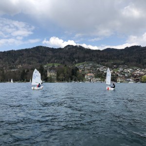 Das Prozedere vom Einwassern haben wir langsam im Griff und ist eine Routinearbeit geworden. Das gibt uns an diesem Karfreitag auf dem Thunersee die Gelegenheit zu segeln und die Mädels auf ihren Optimisten zu coachen.